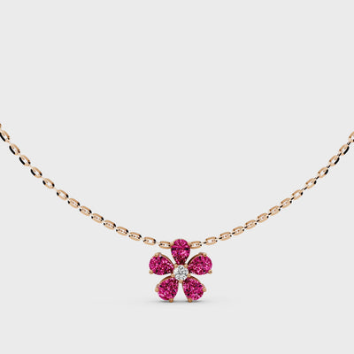 Radiating elegance, this floral pendant features 3.75 carats of pear-shaped rubies encircling 0.30 carats of round diamonds (GH color, VS clarity), set in 6g of 18k rose gold.