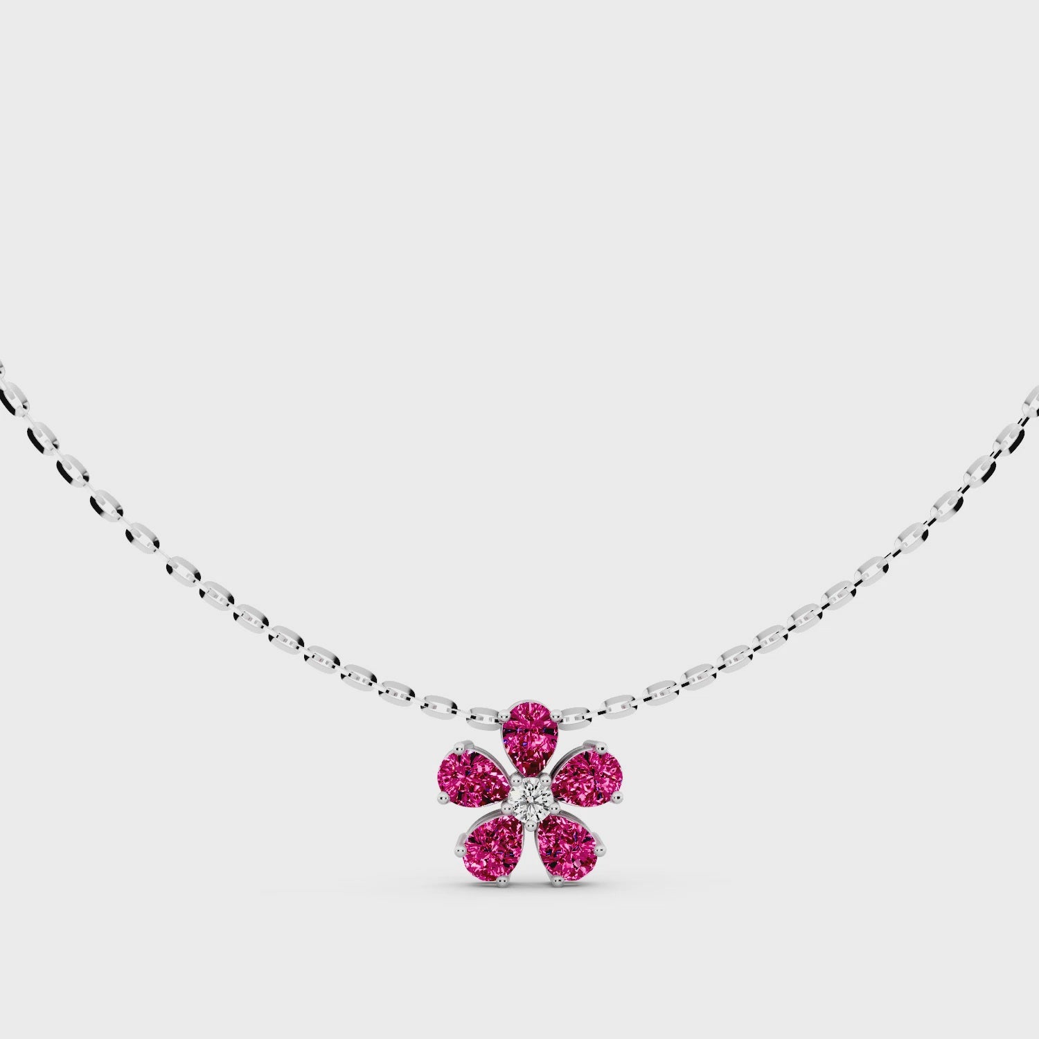 Radiating elegance, this floral pendant features 3.75 carats of pear-shaped rubies encircling 0.30 carats of round diamonds (GH color, VS clarity), set in 6g of 18k white gold.