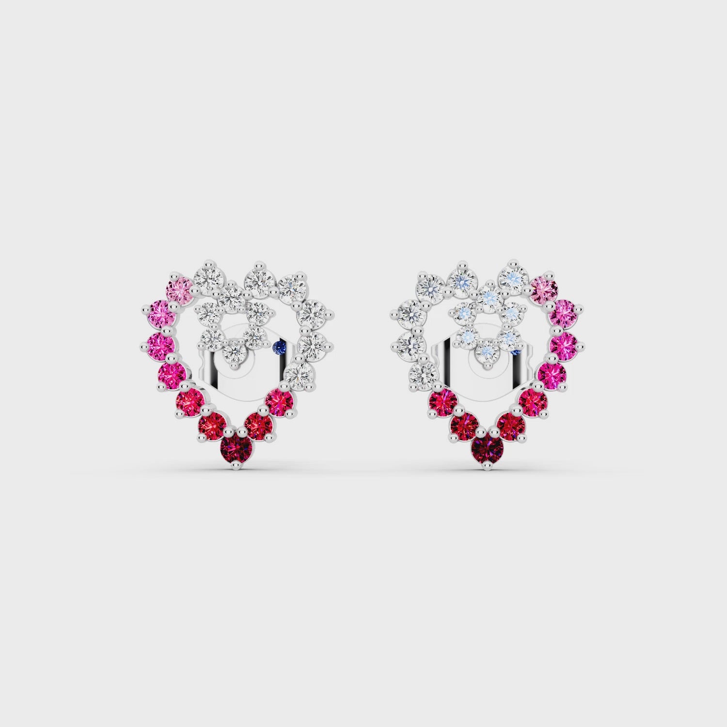 The cool elegance of white gold frames a heart-shaped union of vivid round rubies and GH color, VS clarity diamonds, symbolizing timeless devotion. This 18k white gold masterpiece carries 0.28 carats of diamonds and 0.24 carats of rubies, with a total gold weight of 2.89g.