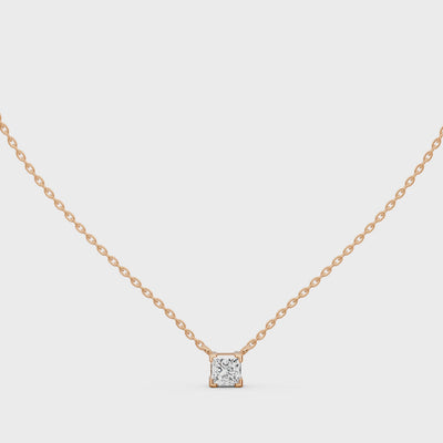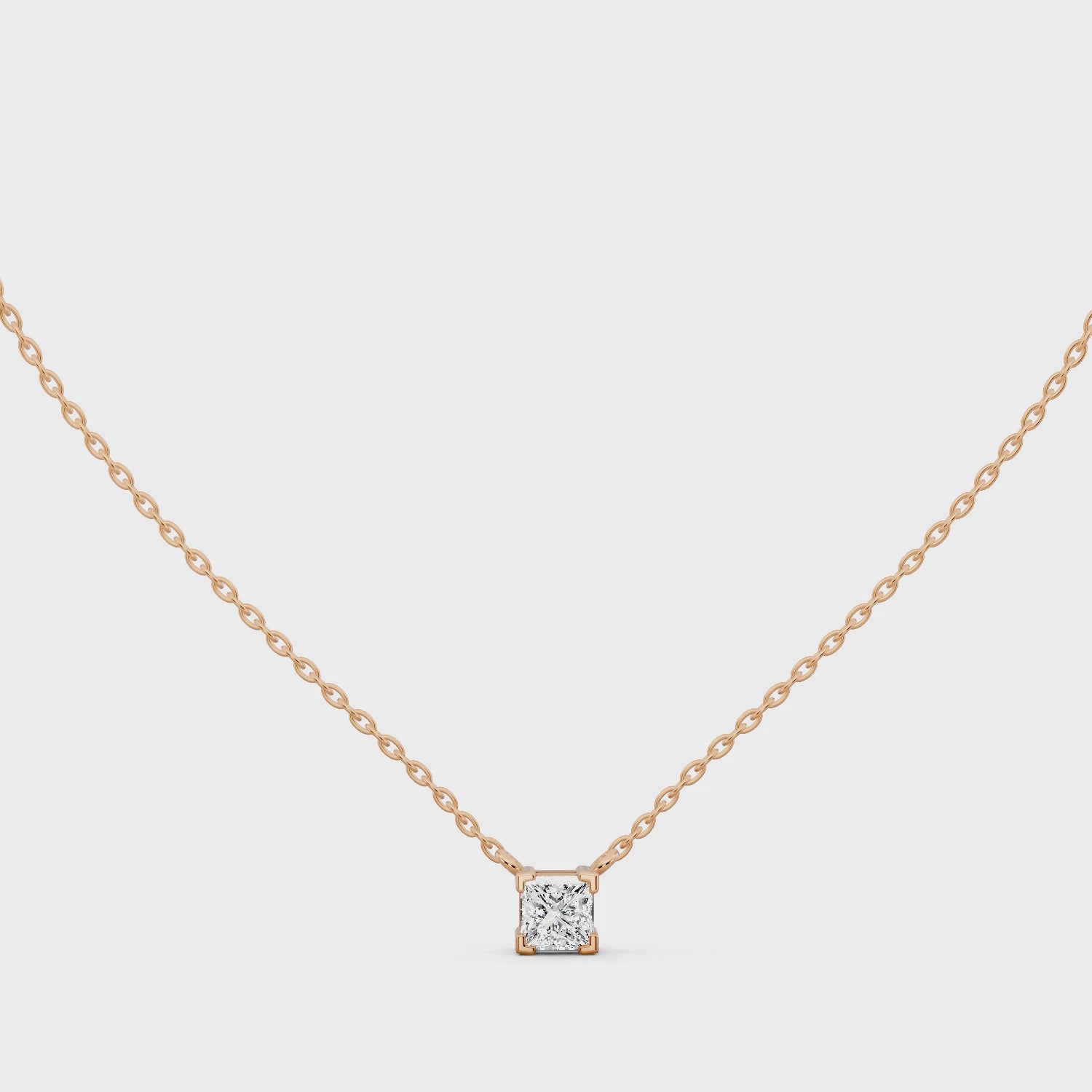 Sharp elegance meets subtle brilliance in this refined necklace, showcasing a 0.50-carat princess-cut diamond of GH color and VS clarity. Crafted in 4g of rose gold, it blends contemporary edge with soft romantic charm, a perfect balance of power and grace.
