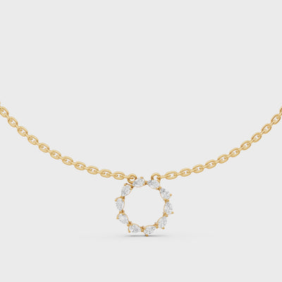 A poetic loop of elegance, this pendant features 0.95 carats of pear-shaped GH color, VS clarity diamonds forming a radiant full-circle silhouette. Crafted in 5.23g of yellow gold, it symbolizes unity, flow, and timeless femininity in every facet.
