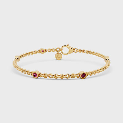 Delicately crafted in 3 grams of yellow gold, this bracelet features 0.20 carats of round-cut rubies — radiant and refined. A symbol of quiet strength and passion, each ruby whispers elegance with every movement.