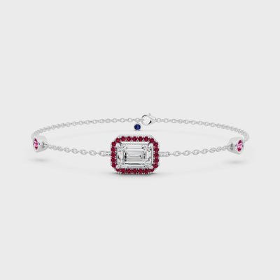 The Imperial Emerald Bracelet radiates timeless sophistication with a 1.00 carat emerald-cut diamond of GH color and VS clarity, framed by 0.30 carat rubies. Set in 3.3g of 18k white gold, it exudes refined elegance.