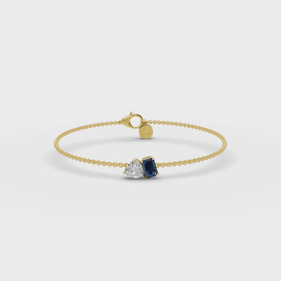 The Eterna Duo Bracelet glows with refined charm, showcasing a 0.55 carat emerald-cut sapphire alongside a 0.30 carat heart-shaped diamond of GH color and VS clarity. Designed in 2.17g of 18k yellow gold, it is a jewel of enduring beauty.