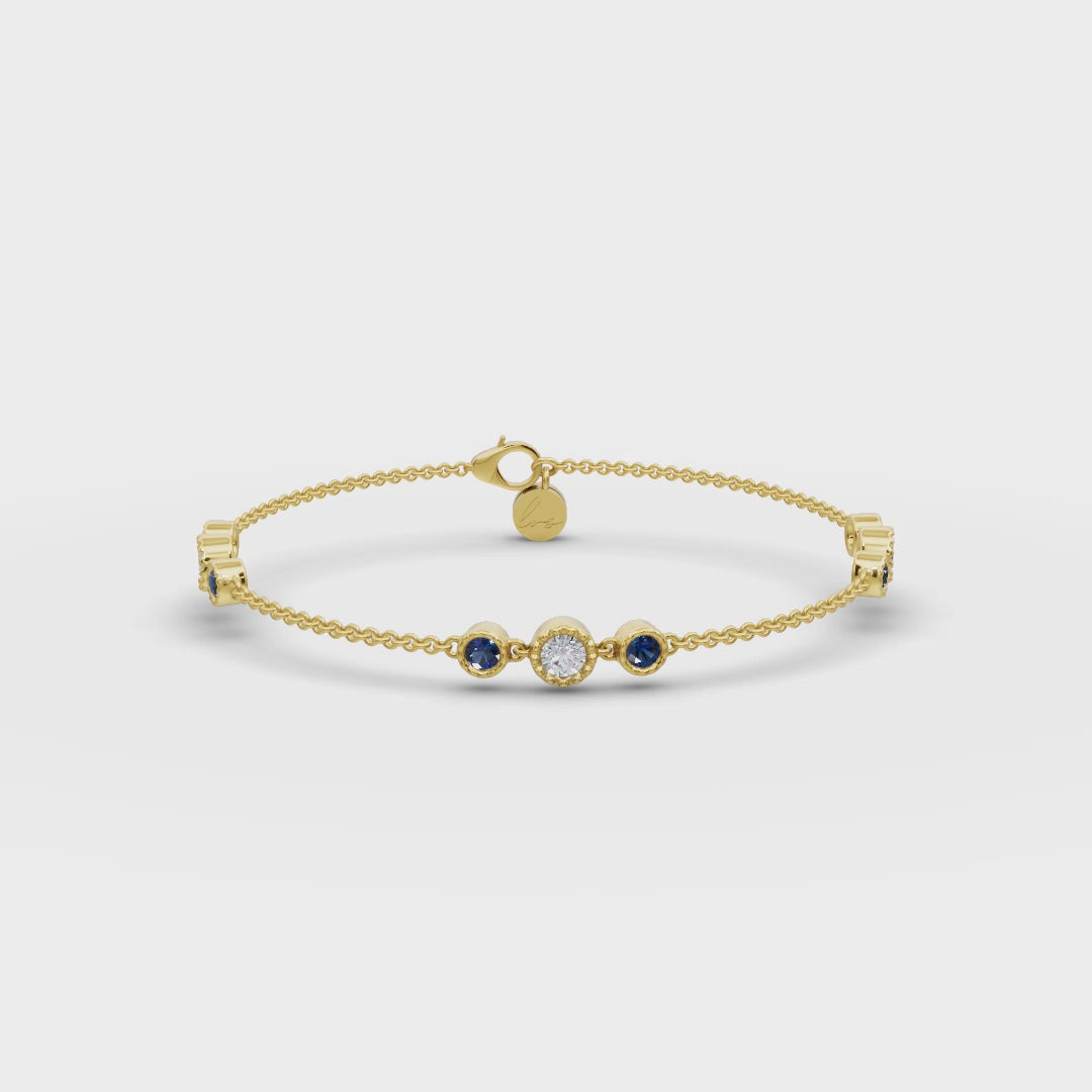 The Celistra Bracelet glows with golden warmth, adorned with a 0.48 carat round diamond in GH color and VS clarity, complemented by 0.766 carats of vivid blue sapphires. Set in 4.7g of 18k yellow gold, it embodies sophistication and charm.
