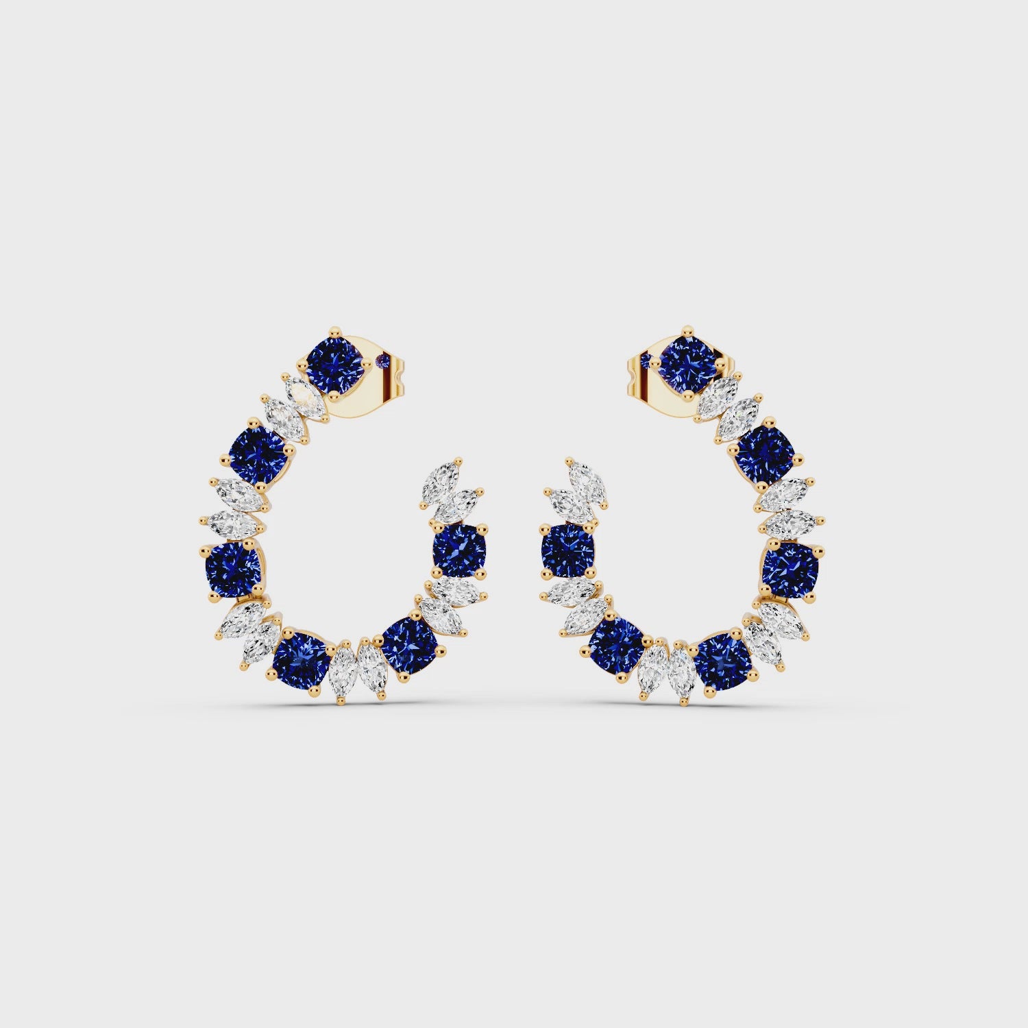 Regal and radiant, these statement hoops feature 1.8 carats of cushion-cut blue sapphires alternating with 1.2 carats of marquise-cut GH color, VS clarity diamonds. Crafted in 4.11g of yellow gold, they evoke the mystery of twilight and the brilliance of royalty in every turn.