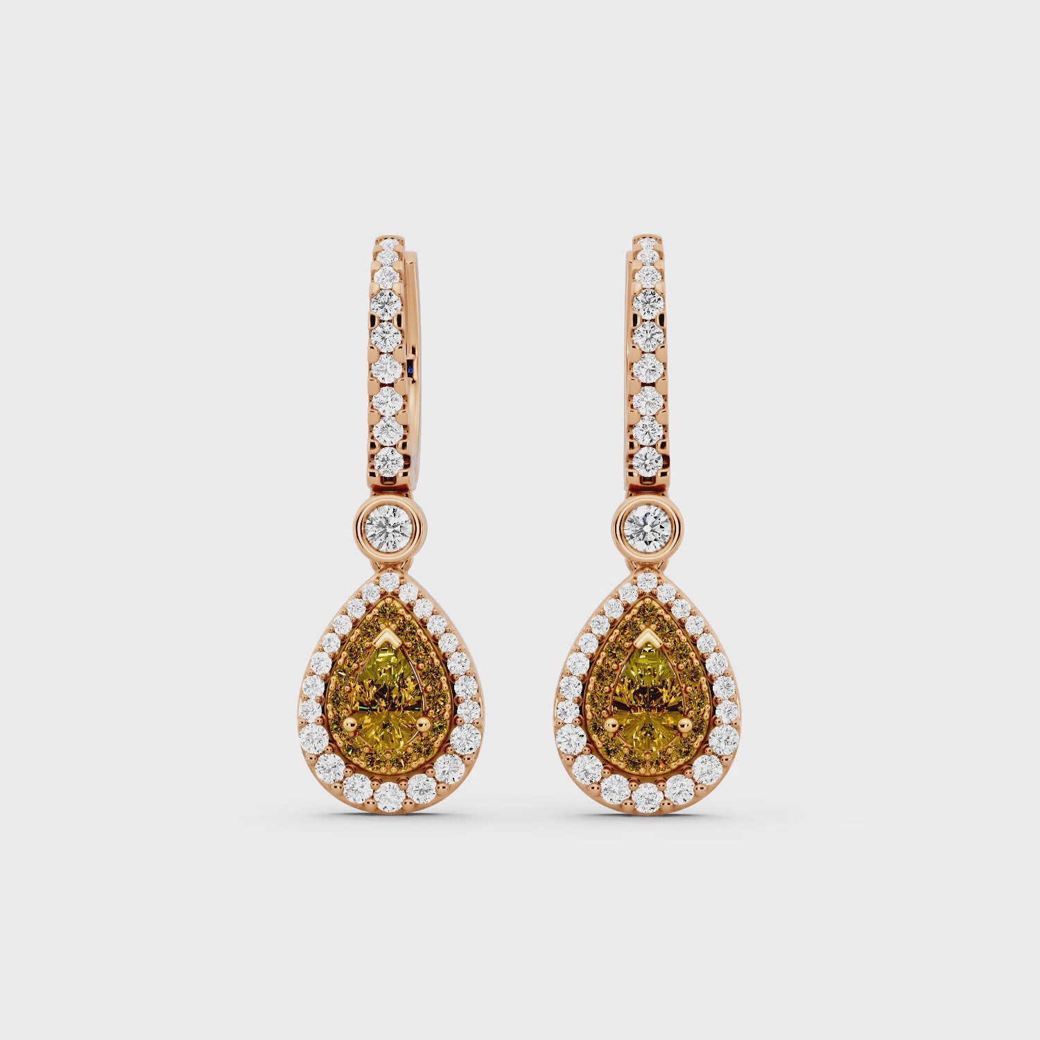 Inspired by morning dew kissed by sunlight, these radiant earrings feature a glowing pear-shaped yellow sapphire embraced by a halo of diamonds. Crafted in 4g of rose gold, they shine with 0.60 carats of pear-cut yellow sapphire and 1.37 carats of round GH color, VS clarity diamonds. Romantic and radiant, they evoke lightness and luxury in every drop.