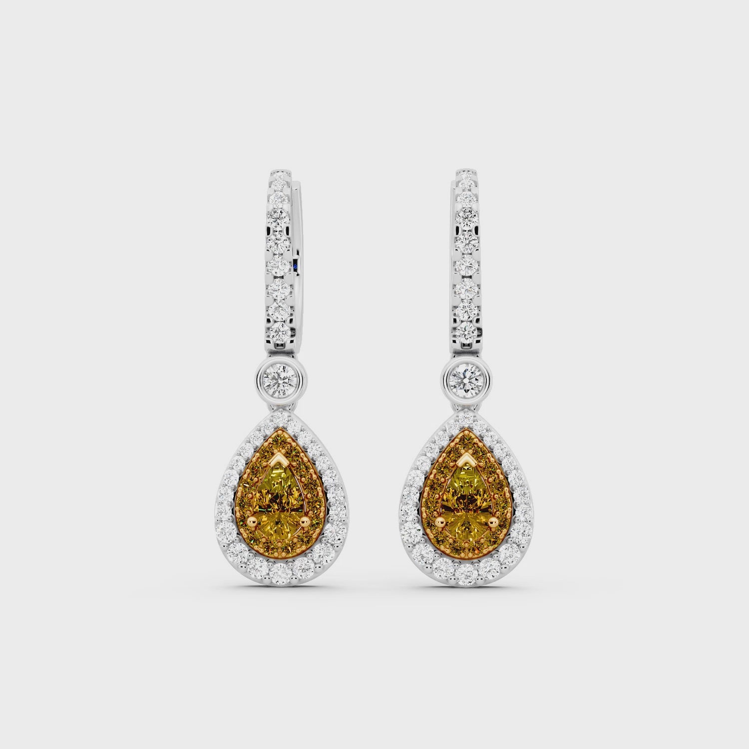 Inspired by morning dew kissed by sunlight, these radiant earrings feature a glowing pear-shaped yellow sapphire embraced by a halo of diamonds. Crafted in 4g of white gold, they shine with 0.60 carats of pear-cut yellow sapphire and 1.37 carats of round GH color, VS clarity diamonds. A refined sparkle that blends classic charm with a modern silhouette.