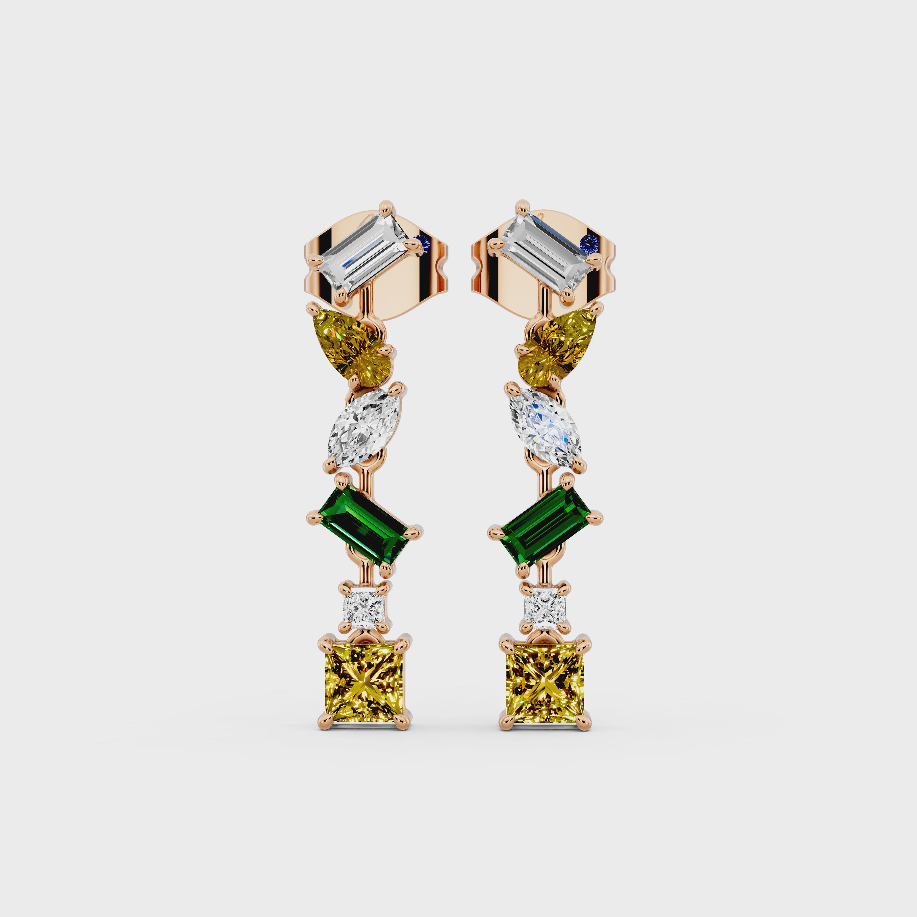A celebration of color and creativity, these sculptural drop earrings feature a vibrant mix of shapes and stones. Crafted in 2.5g of rose gold, they are adorned with 0.78 carats of pear, baguette, and princess-cut colored gemstones, and accented with 0.142 carats of baguette, marquise, and princess-cut GH color, VS clarity diamonds. Romantic and radiant, they bring color to every movement.