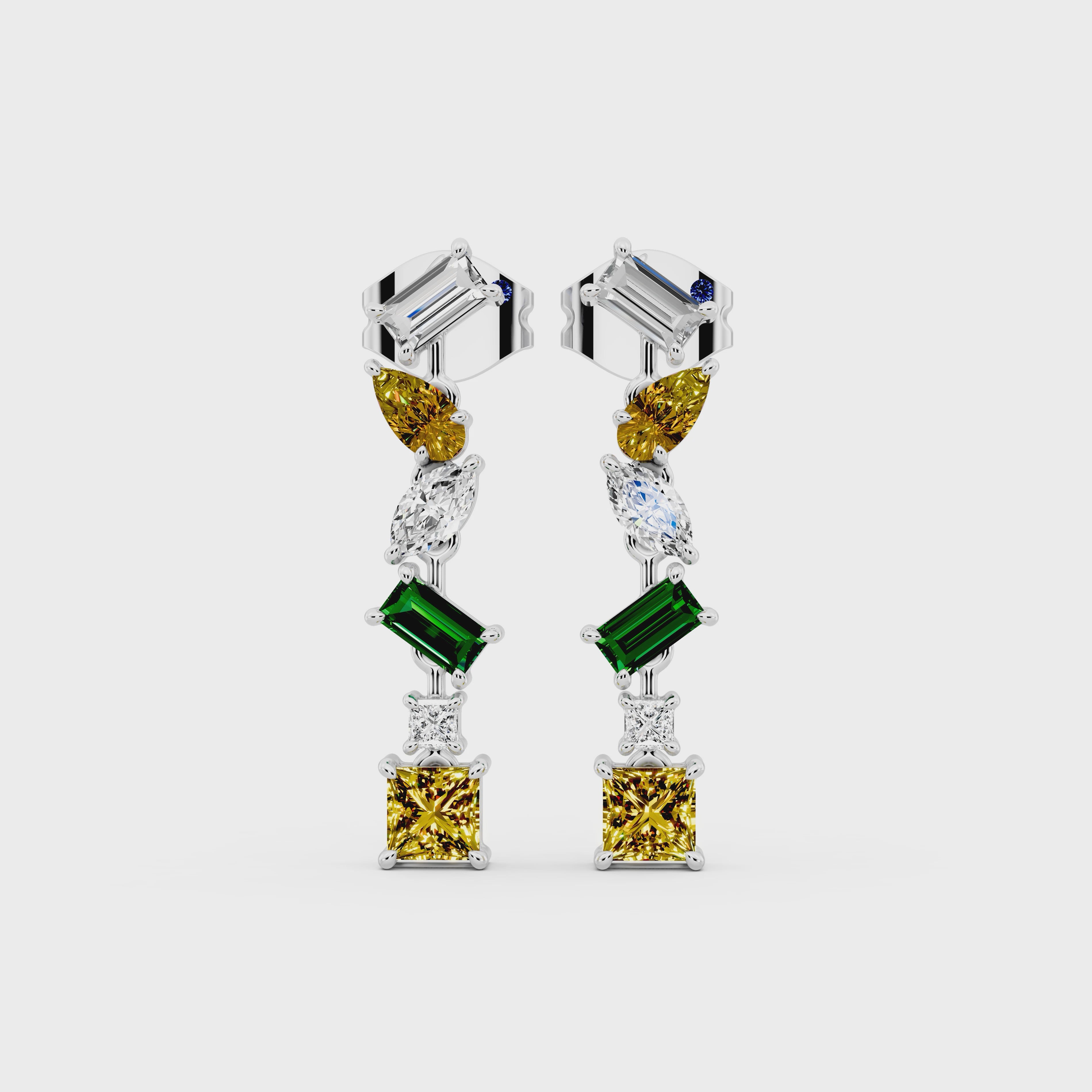 A celebration of color and creativity, these sculptural drop earrings feature a vibrant mix of shapes and stones. Crafted in 2.5g of white gold, they are adorned with 0.78 carats of pear, baguette, and princess-cut colored gemstones, and accented with 0.142 carats of baguette, marquise, and princess-cut GH color, VS clarity diamonds. The perfect balance of structure and sparkle.