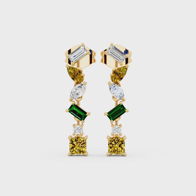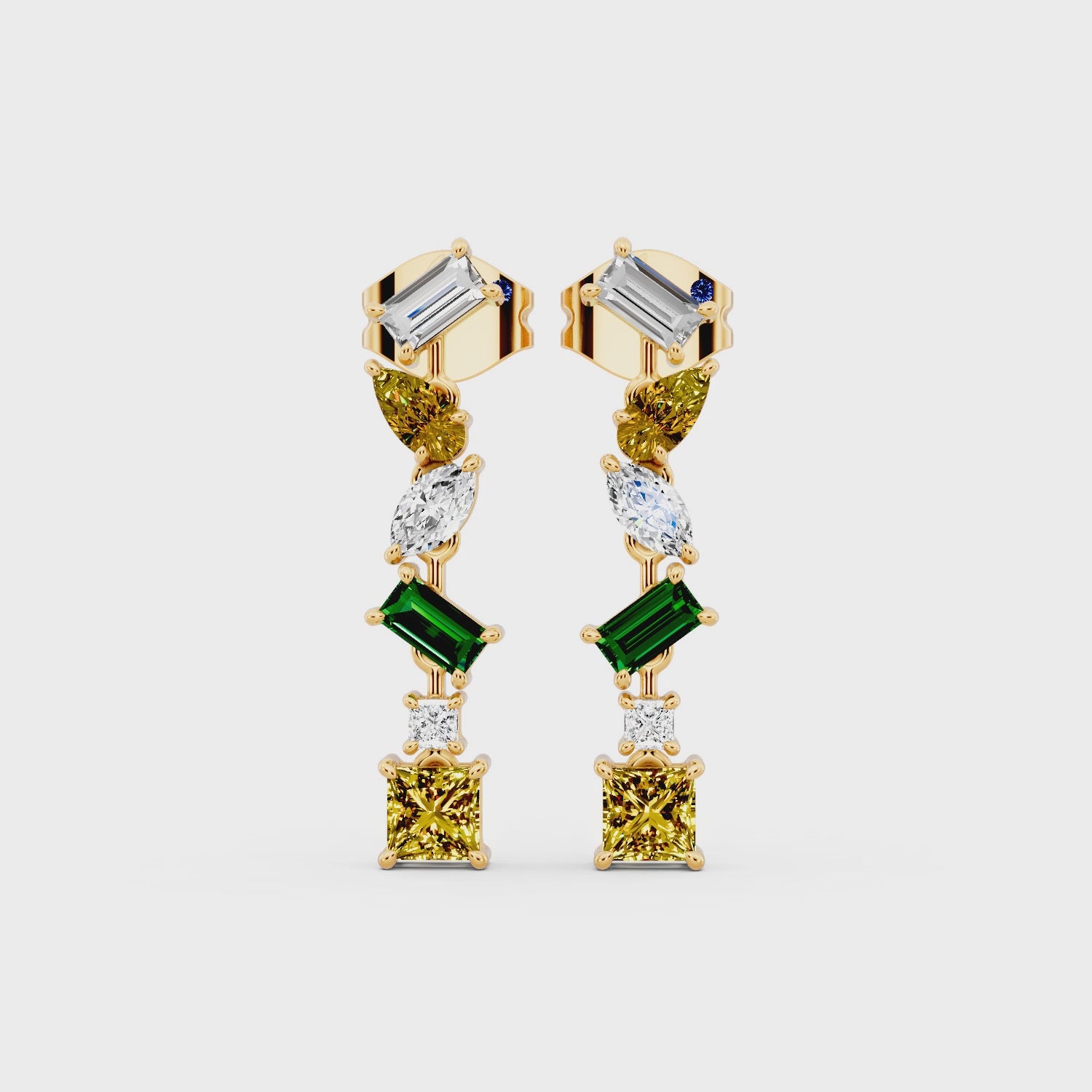 A celebration of color and creativity, these sculptural drop earrings feature a vibrant mix of shapes and stones. Crafted in 2.5g of yellow gold, they are adorned with 0.78 carats of pear, baguette, and princess-cut colored gemstones, and accented with 0.142 carats of baguette, marquise, and princess-cut GH color, VS clarity diamonds. A bold artistic expression with refined elegance.