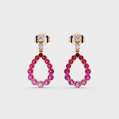 A symphony of bold pink hues and sparkling light, these teardrop earrings evoke passion and joy. Crafted in 3.144g of rose gold, set with 0.96 carats of round ruby gemstones and accented with 0.16 carats of GH color, VS clarity diamonds, they radiate a soft romance and vibrant elegance.