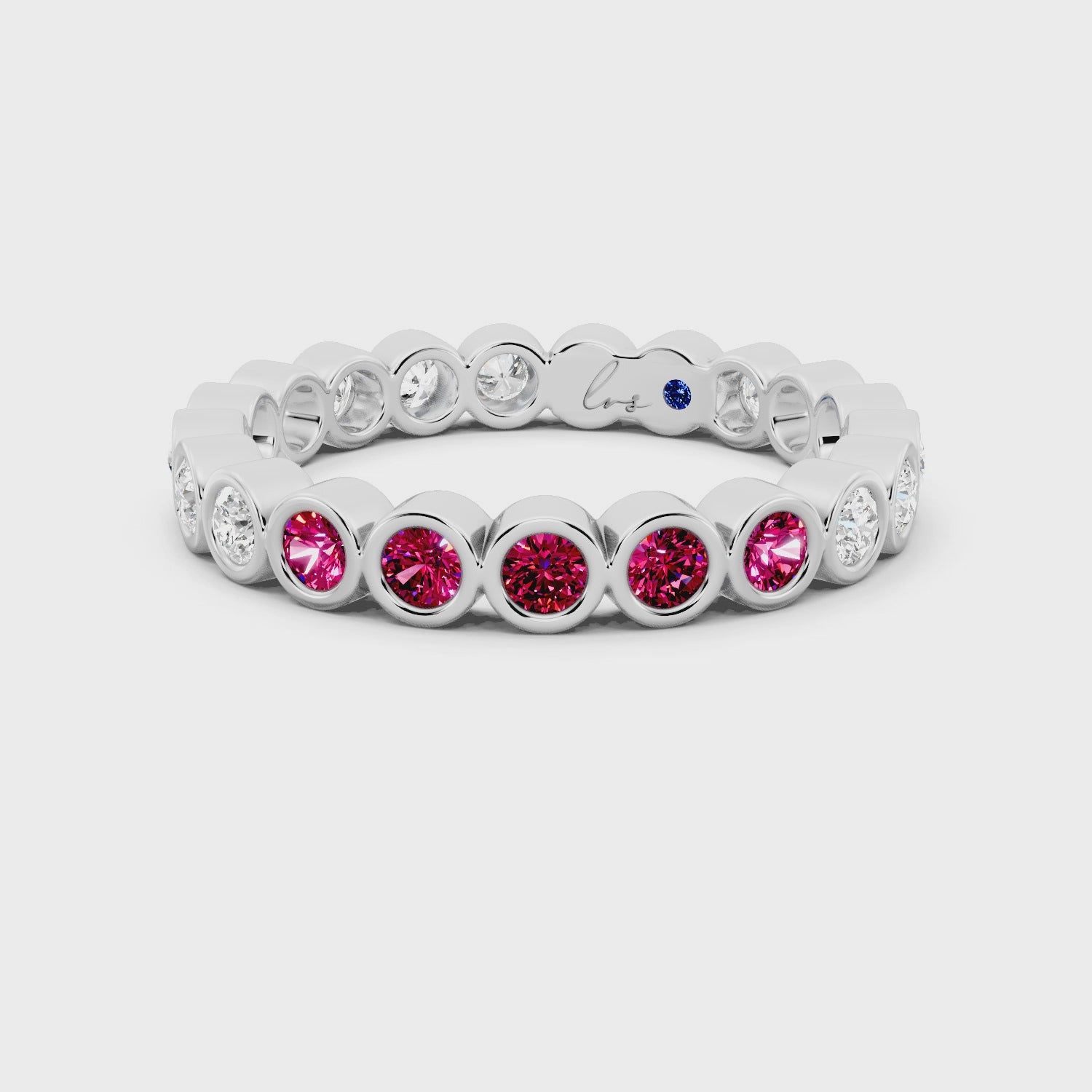 The Rosara Band is a radiant celebration of passion and light. Alternating round rubies (0.20 carat) and diamonds (0.64 carat, GH color, VS clarity) create a rhythmic harmony around the band, their brilliance set in 2.6 grams of 18k white gold. A timeless circle of fire and purity, it speaks of love that endures and glows.