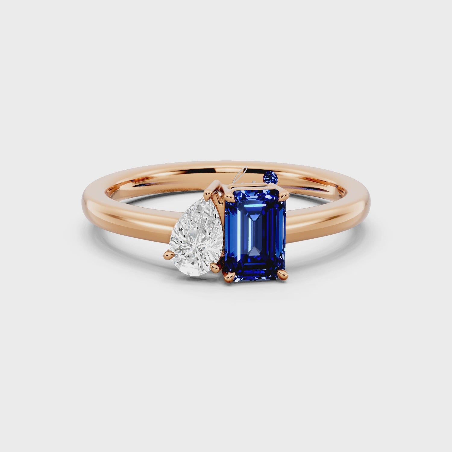 The Saphira Ring captures the poetry of duality — the deep mystery of a 0.30 carat emerald-cut sapphire paired with the brilliance of a 0.30 carat pear-shaped diamond (GH color, VS clarity). Set in 2.7 grams of 18k rose gold, this design unites contrasting shapes and hues in a perfect balance of harmony and elegance.