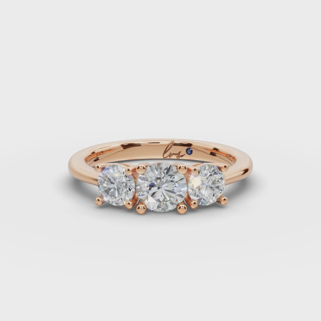 The Trinara Ring symbolizes unity, past, present, and future through three luminous round diamonds totaling 1.1 carats (GH color, VS clarity). Each diamond radiates brilliance while set in a refined band of 2.7 grams of 18k rose gold, creating a timeless design that celebrates everlasting elegance.
