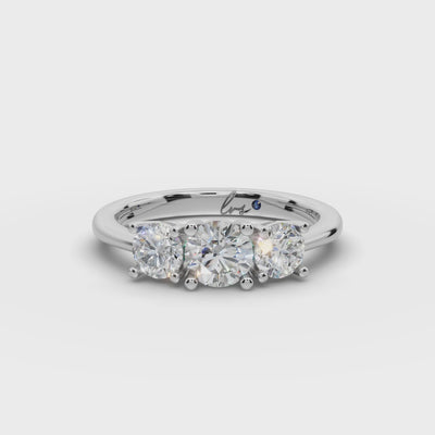 The Trinara Ring symbolizes unity, past, present, and future through three luminous round diamonds totaling 1.1 carats (GH color, VS clarity). Each diamond radiates brilliance while set in a refined band of 2.7 grams of 18k white gold, creating a timeless design that celebrates everlasting elegance.