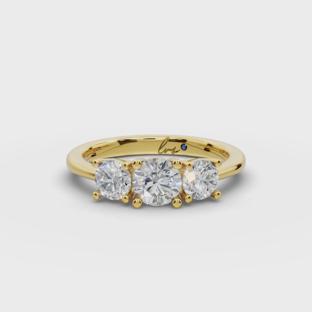 The Trinara Ring symbolizes unity, past, present, and future through three luminous round diamonds totaling 1.1 carats (GH color, VS clarity). Each diamond radiates brilliance while set in a refined band of 2.7 grams of 18k yellow gold, creating a timeless design that celebrates everlasting elegance.