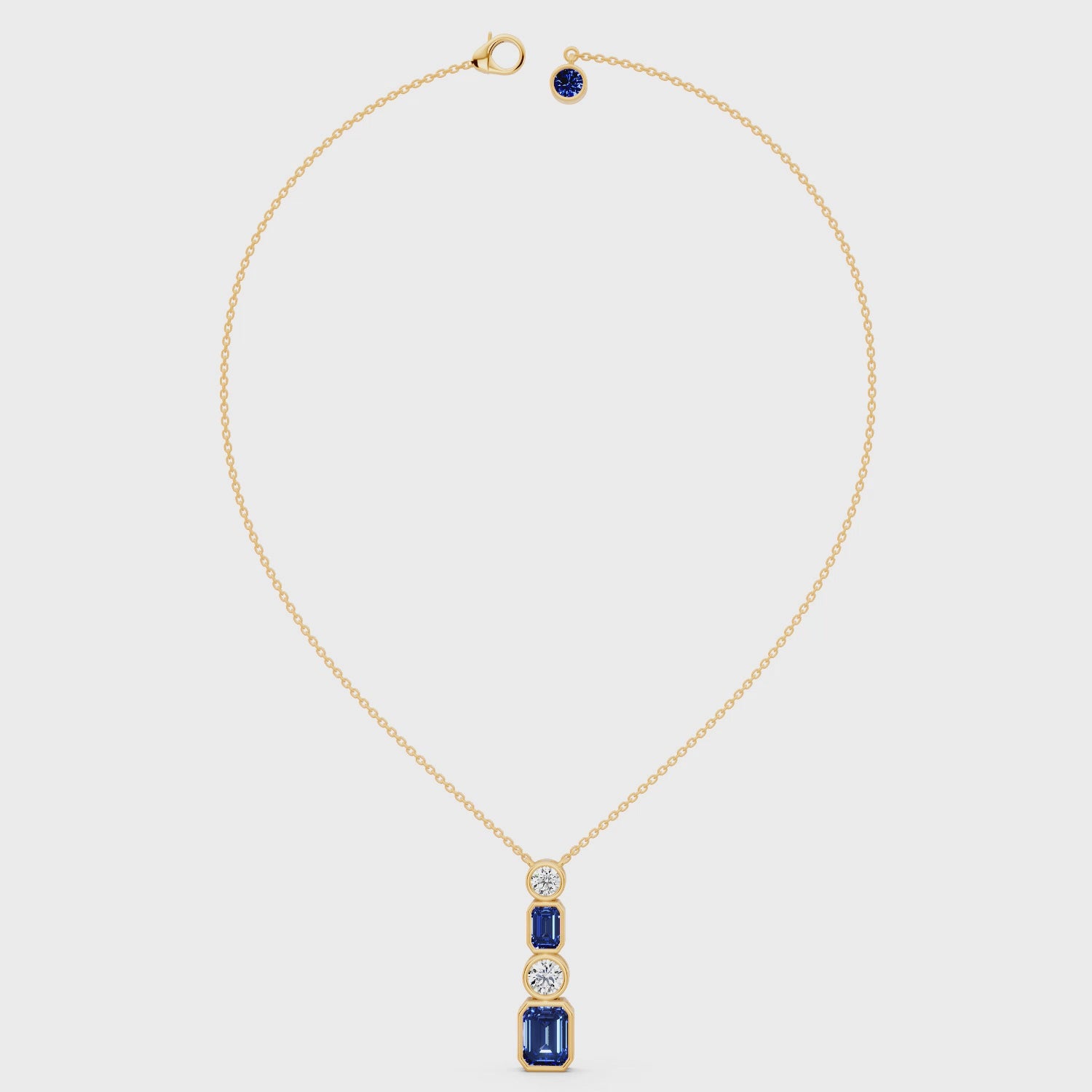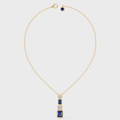 The Aurevia Pendant is a cascade of elegance, featuring 2.7 carats of emerald-cut blue sapphires paired with 0.8 carats of brilliant round diamonds, GH color and VS clarity. Suspended from 4.2g of 18k yellow gold, this design symbolizes harmony between depth and light.