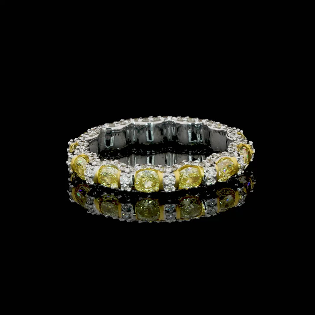 A continuous flow of fancy vivid yellow diamonds, each encircled by white diamond brilliance, forms a band of unbroken radiance. Like a circle of fire captured in precious stone, this creation symbolizes passion without end and light that never fades. Contact us for inquiry.