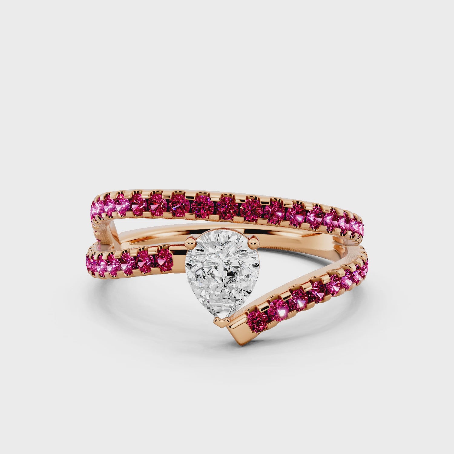 A powerful symbol of passion and grace, the Crimson Embrace Ring features a dazzling 0.50 carat pear-shaped diamond, GH color and VS clarity, cradled between two vivid rows of round-cut rubies totaling 0.57 carats. This captivating design is masterfully crafted in 3.12 grams of rose gold, creating a wraparound effect that evokes both strength and elegance. The striking contrast between fiery rubies and luminous diamond makes this piece a bold statement of love, individuality, and feminine power.