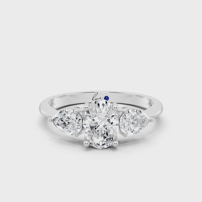 The Evelina Ring embodies timeless grace with a modern touch. Crafted in 2.11g of white gold, it features a 1.6 carat diamond arrangement of GH color and VS clarity. At the heart lies a brilliant oval diamond, gracefully flanked by two pear-shaped side stones that enhance its brilliance with fluid symmetry. A creation that balances strength and softness, designed to celebrate enduring love and elegance.