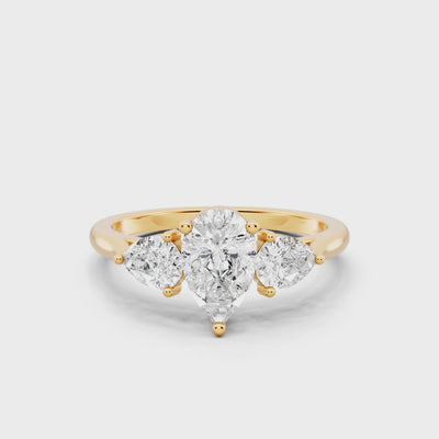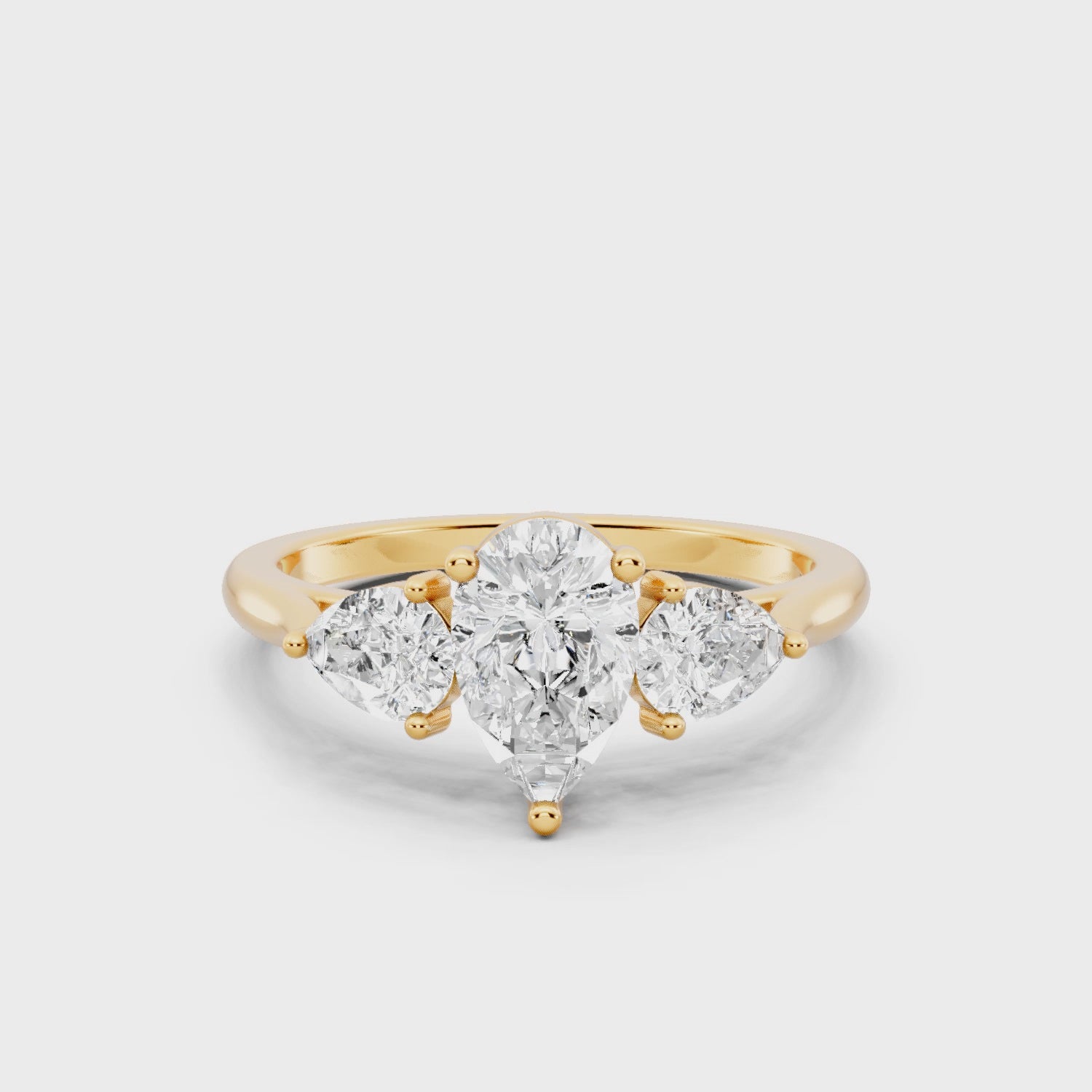 A radiant tribute to love’s journey, the Trinity Flame Ring features three glowing pear-shaped diamonds totaling 1.6 carats, chosen for their GH color and VS clarity. Set in 2.6 grams of yellow gold, the warm hue amplifies the intensity of each diamond’s sparkle. With its graceful silhouette and symbolic depth, this ring tells a story of connection, memory, and enduring beauty.