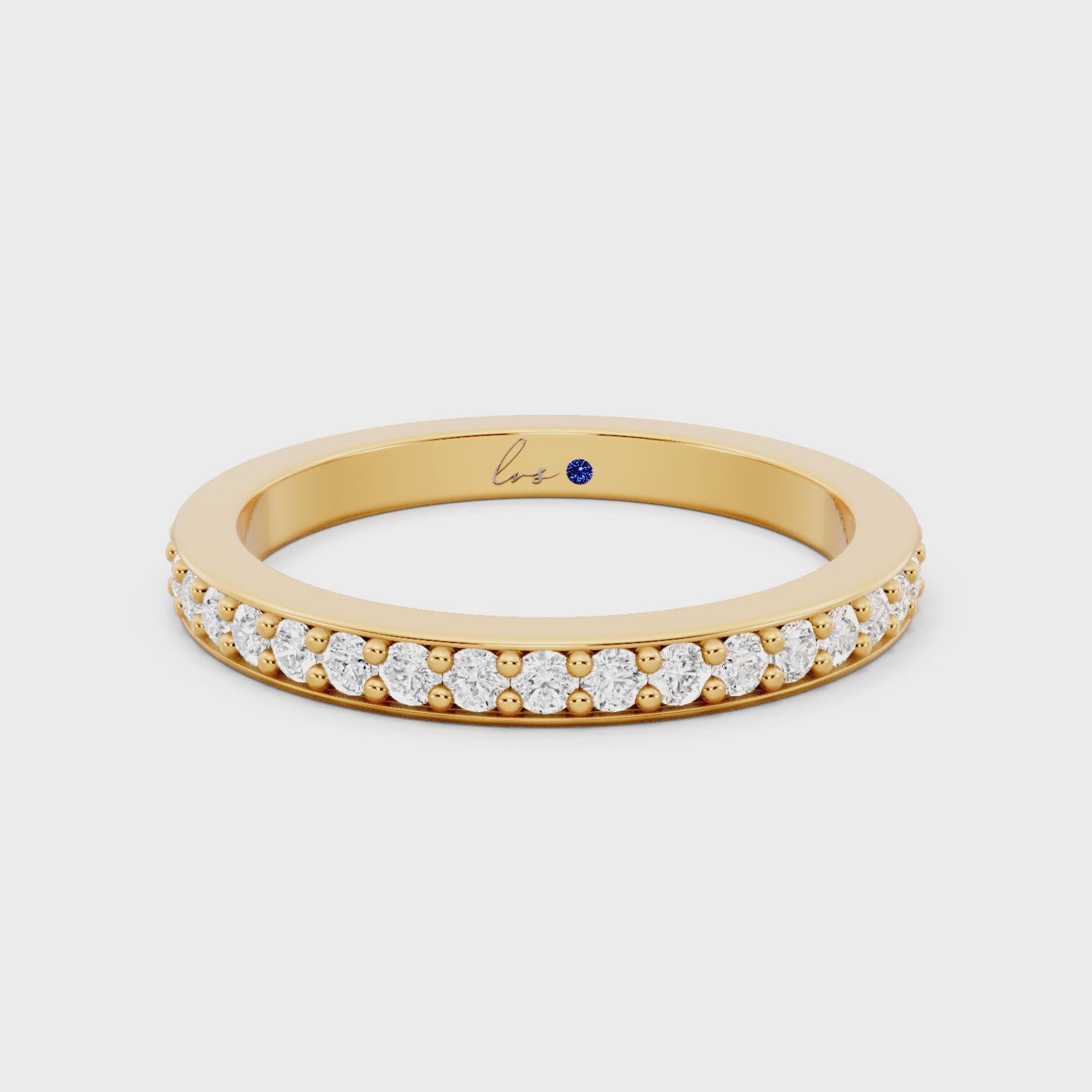 Classic and radiant, the Celeste Diamond Eternity Band is crafted in 2.6g of yellow gold, set with 0.57 carats of round-cut diamonds in GH color and VS clarity. Its warm golden hue beautifully enhances the diamonds’ fire, creating a piece of timeless sophistication.