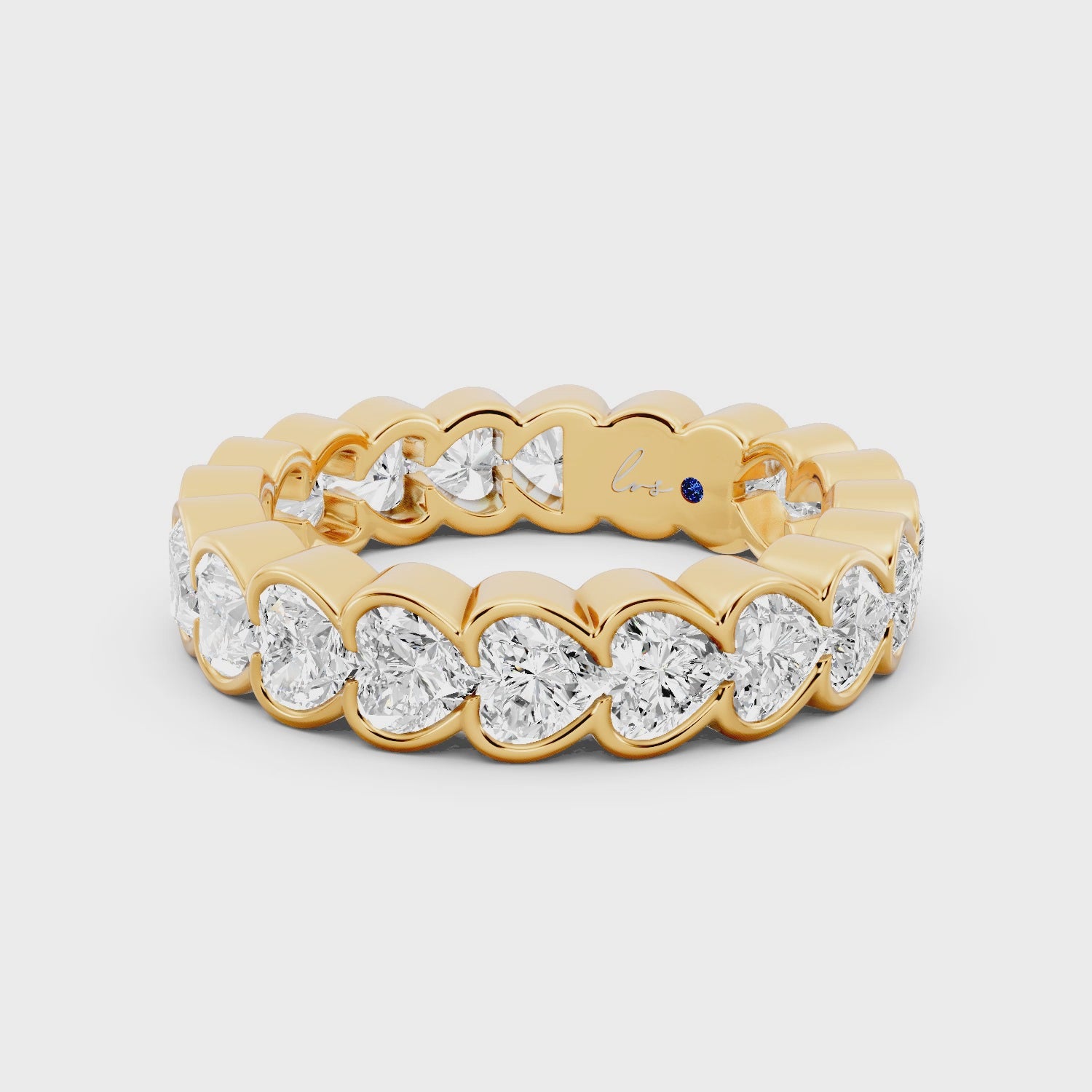 The Amour Éternel Diamond Band glows with timeless romance, crafted in 4g of yellow gold and set with 3.00 carats of heart-shaped diamonds in GH color and VS clarity. Its warm gold hue embraces the diamonds’ sparkle, creating a piece as enduring as love itself.
