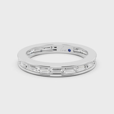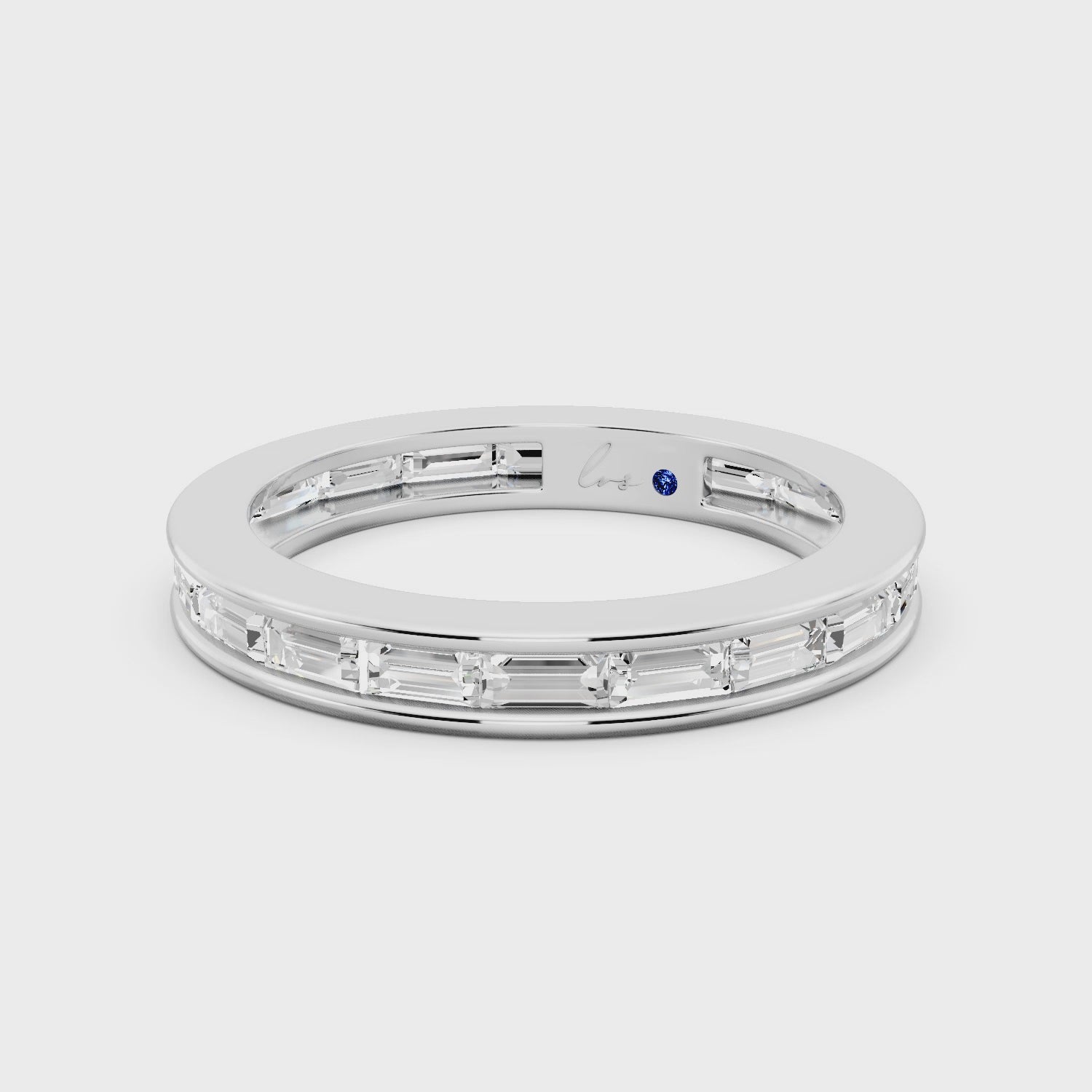 The Lumière Baguette Diamond Band captures a refined brilliance, crafted in 2.48g of white gold with 1.00 carat of baguette-cut diamonds in GH color and VS clarity. Its clean lines and understated sparkle make it an essential piece for timeless luxury.