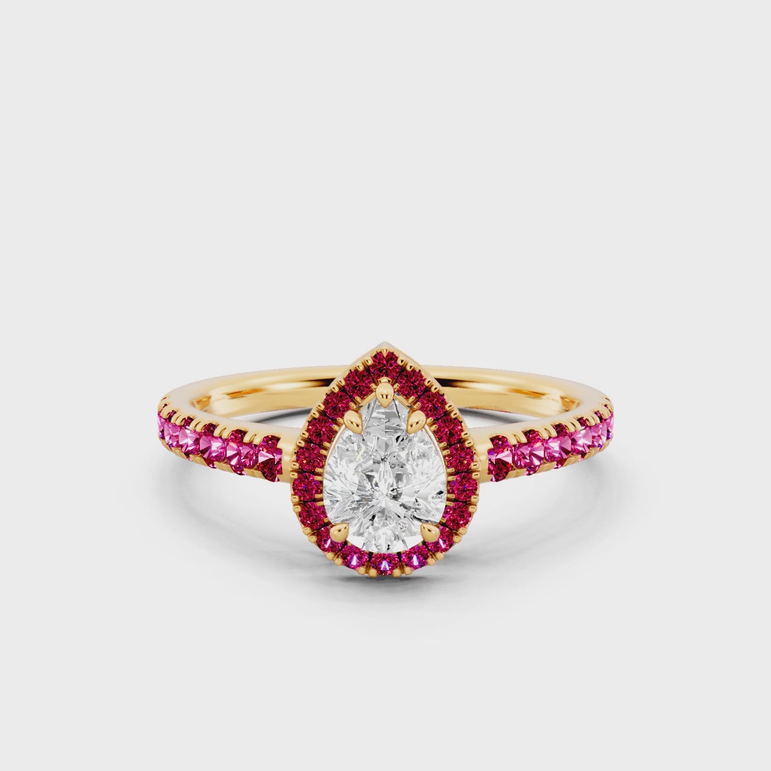 Handcrafted in 2.50g of radiant yellow gold, the Crimson Halo Ring frames a 0.70ct GH color, VS clarity pear-shaped diamond with a crown of 0.37ct deep red rubies. The warm glow of the gold enhances the ring’s timeless charm and romantic allure.