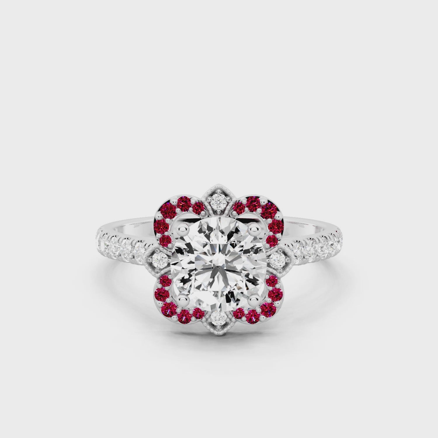 Handcrafted in 2.70g of sleek white gold, the Ruby Bloom Ring showcases a 1.20ct GH color, VS clarity round diamond embraced by a delicate ruby floral halo. Diamonds along the band add brilliance, while the crisp white gold accentuates the vivid red of the rubies.
