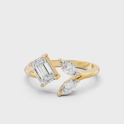 Handcrafted in 2.17g of 18k yellow gold, the Celeste Duality Ring features 0.80 carats of GH color, VS clarity diamonds in two distinct cuts — the linear elegance of an emerald-cut paired with the graceful curves of a marquise. The warm gold setting enriches the brilliance, creating a design that is both bold and refined.