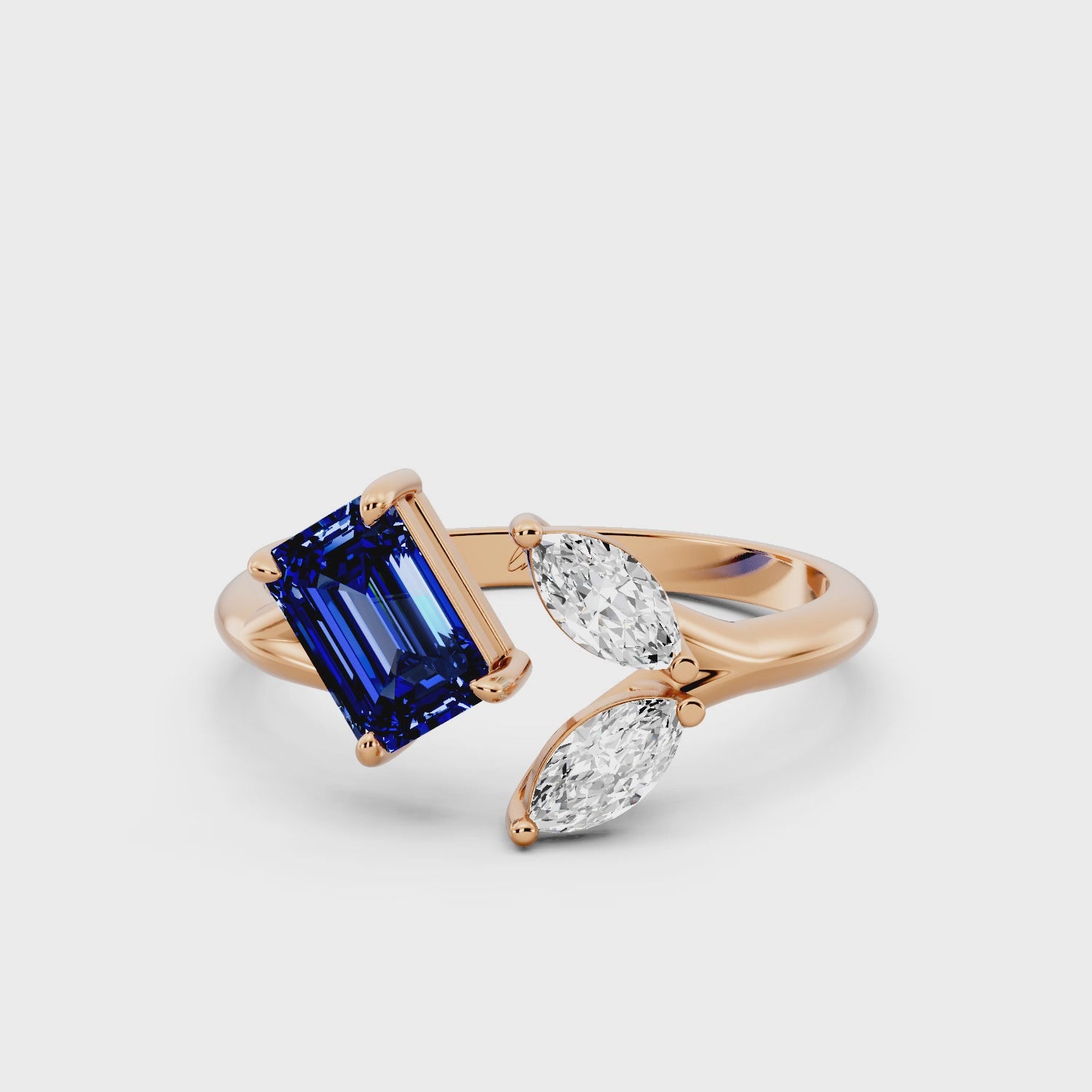 Handcrafted in 2.17g of 18k rose gold, the Azure Harmony Ring showcases the captivating contrast of a 0.50-carat emerald-cut blue sapphire and a 0.30-carat GH color, VS clarity marquise diamond. This open-band design merges vibrant color with timeless sparkle, creating a refined symbol of elegance and balance.