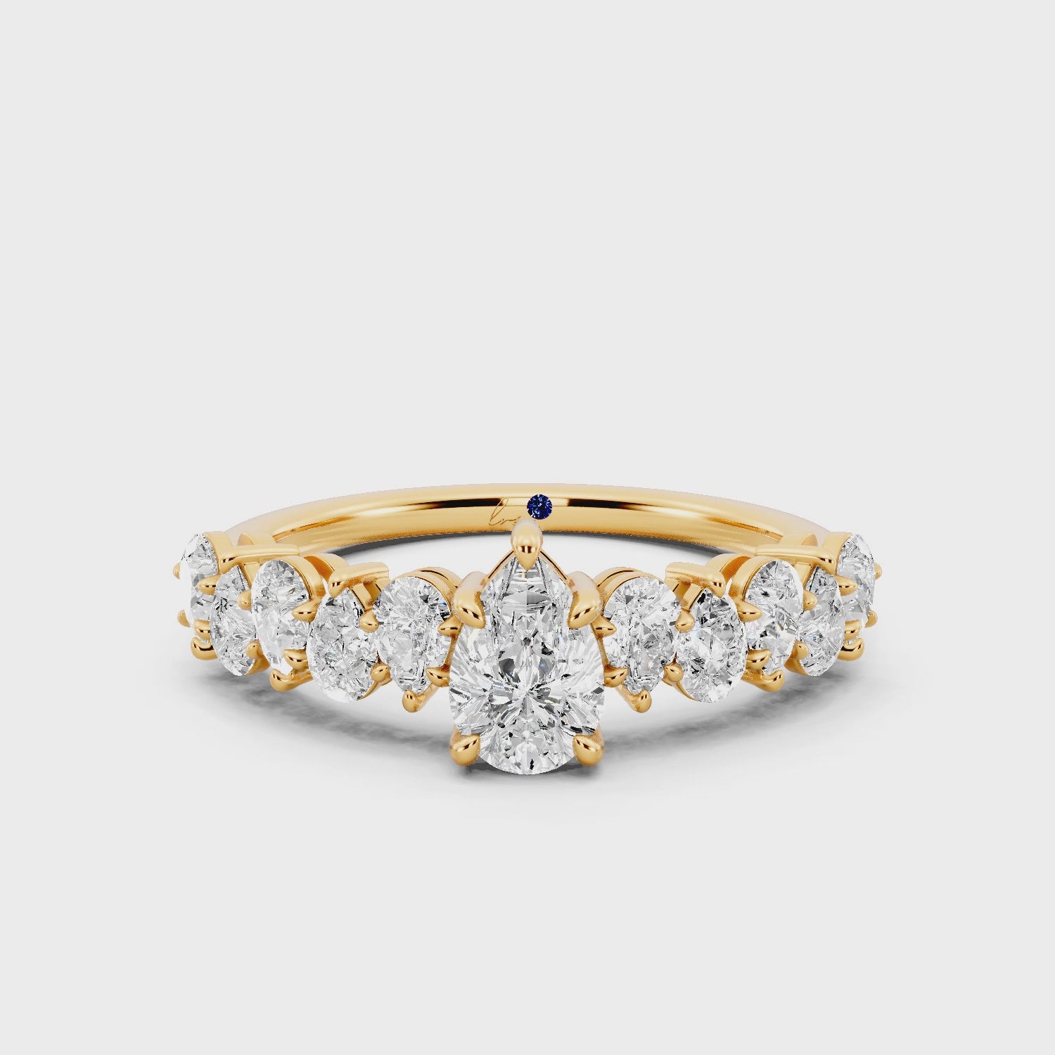 Handcrafted in 2.19g of 18k yellow gold, the Cascata Brilliance Ring glows with warmth, adorned with 1.7 carats of GH color, VS clarity pear-shaped diamonds. The rich golden hue complements the brilliance of each diamond, creating a radiant design for all occasions.