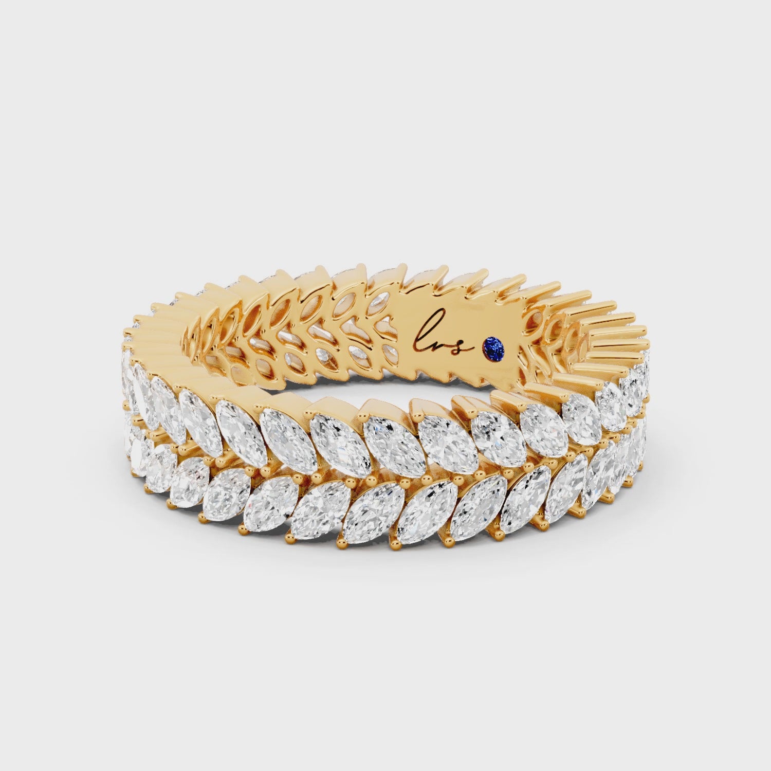 The Lunaria Band captures light with striking brilliance, featuring 4.76 carats of marquise-cut diamonds (GH color, VS clarity) set in perfect symmetry. Crafted in 5.5 grams of 18k yellow gold, its double-row design evokes timeless luxury and modern sophistication.